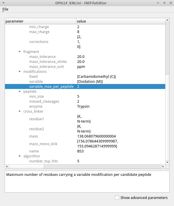 The INIFileEditor shows a description of each parameter at the bottom and helps to fill out many parameters, e.g. by using a file browser to select input and output files and showing the possible choices of parameters with limited options. To see the full list of parameters, including advanced parameters that should not be necessary for most users, check the box for advanced parameters on the bottom. The INI files can also be edited using a text editor when opening a GUI is not possible, e.g. when working on a remote server.